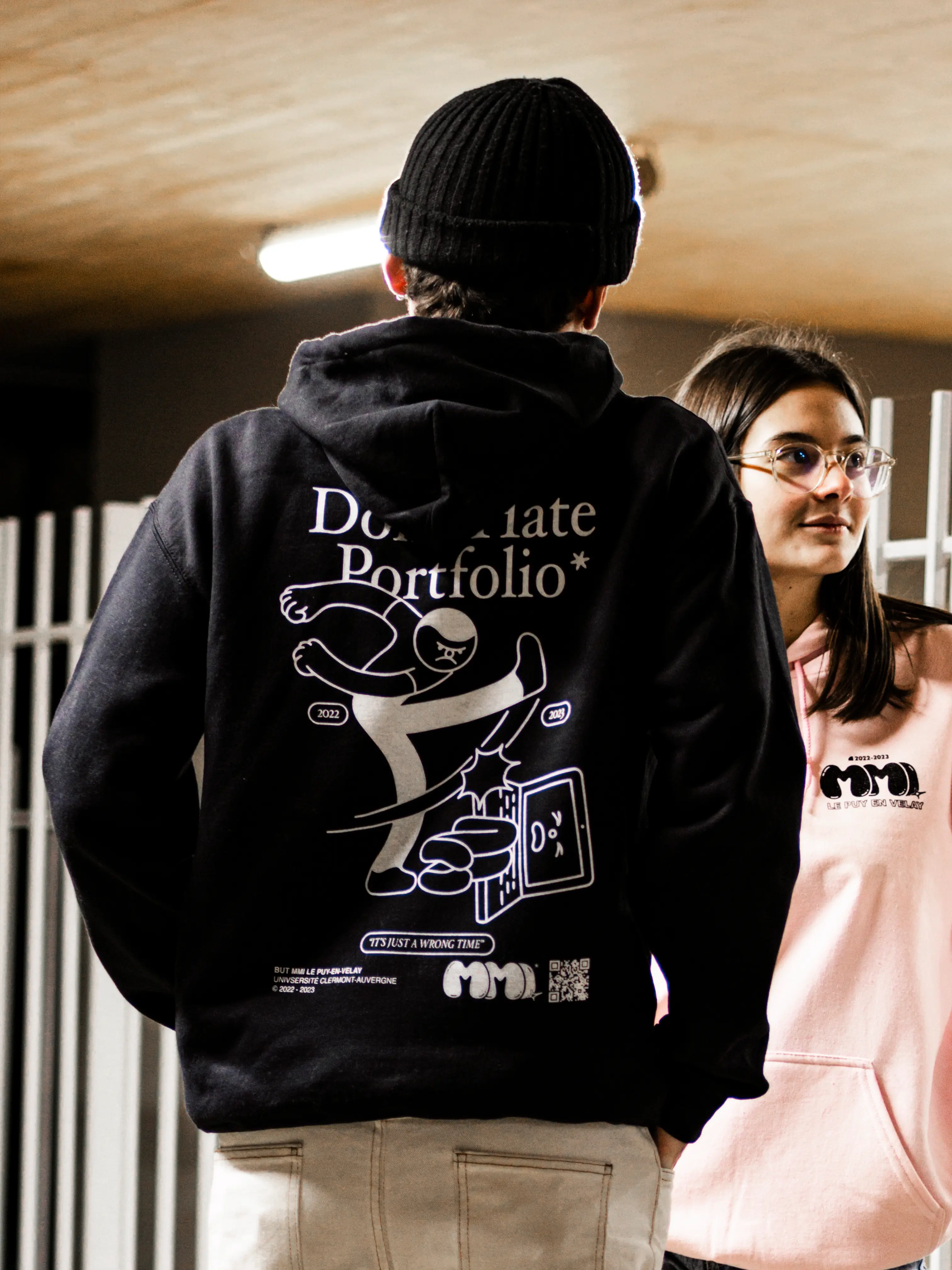 Vous prenez contact avec nous pour une demande de devis, que nous ajustons si besoin et validons. Nous travaillons ensuite sur le design si telle est votre demande – cette prestation est offerte si vous choisissez de faire imprimer votre commande chez nous, auquel cas elle vous sera facturée à hauteur de 200 € TTC, peu importe le nombre de retouches. Vous lancez alors votre campagne de précommande – avec les affiches et publications que nous avons faites pour, si la prestation est comprise dans l'offre (voir la page « Catalogue ») – permettant de commander les vêtements en base vierge ; c'est là que nous vous transmettons la facture et que vous payez un premier acompte équivalent à 50 % de celle-ci. Nous imprimons et expédions votre commande ; à sa réception, vous payez enfin le deuxième acompte pour compléter la facture.